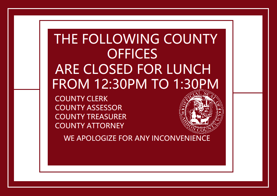 The following County offices will be closed for Lunch from 12:30pm to 1:30pm Monday thru Friday: