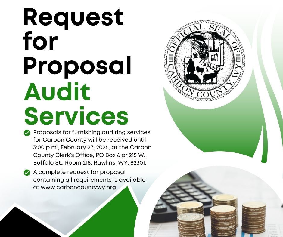 Proposals for furnishing auditing services for Carbon County will be received until 3:00 p.m., February 27, 2026, at the Carbon County Clerk’s Office, PO Box 6 or 215 W. Buffalo St., Room 218, Rawlins, WY, 82301. A complete request for proposal for independent audit services containing all requirements is available here.